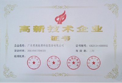 經(jīng)廣東省科技廳、廣東省財(cái)政廳、廣東省稅務(wù)局和行業(yè)專家審定,我公司通過(guò)了國(guó)家高新企業(yè)技術(shù)認(rèn)證,并于2014年1月22日拿到了《高新技術(shù)企業(yè)》的牌匾和《高新技術(shù)企業(yè)證書》(證書編號(hào):GR201344000032)。